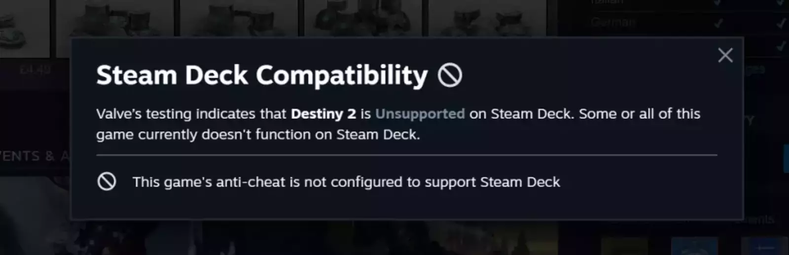 На странице игры компания Valve подтверждает, что Destiny 2 не поддерживается из-за античит-программы игры. Однако, учитывая сообщения команды, могут быть другие факторы, препятствующие запуску игры на портативном устройстве.