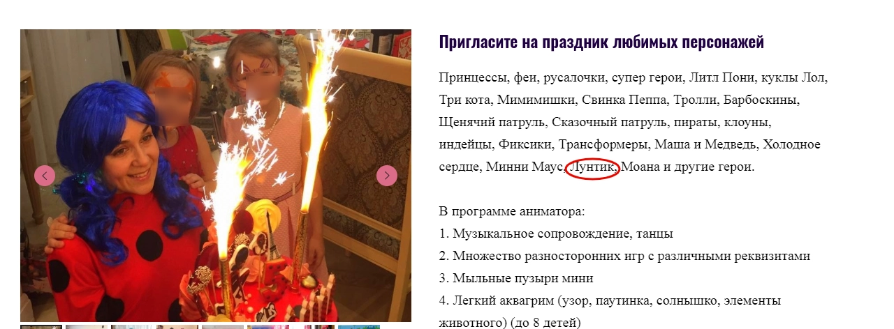 На странице «праздник-химки.рф» выступление артиста-«Лунтика» указано среди доступных услуг как минимум дважды. Пригласить «необычного малыша» на детский праздник жители северного Подмосковья и прилегающих районов Москвы могут за 2800 рублей.