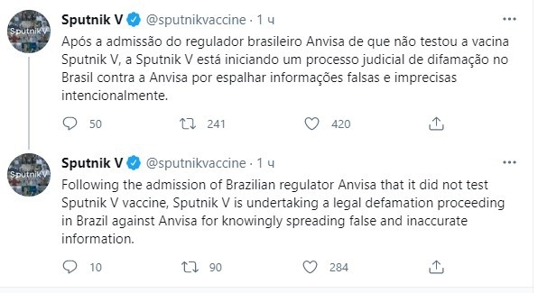После того, как бразильский регулирующий орган Anvisa признал, что не тестировал вакцину «Спутник V», «Спутник V» проводит в Бразилии судебное разбирательство по делу о диффамации против Anvisa за умышленное распространение ложной и неточной информации, — говорится в официальном Twitter вакцины.