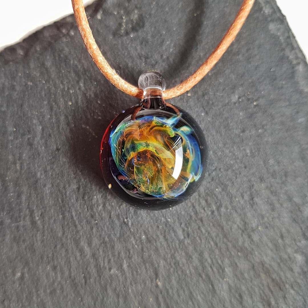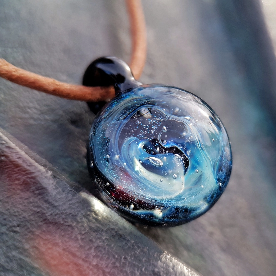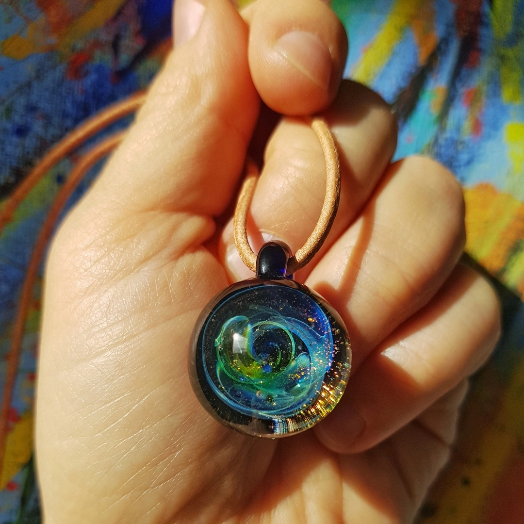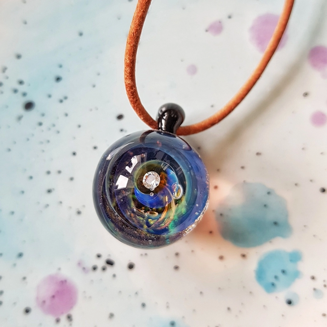«Моей любимой работой, пожалуй, является кулон-галактика. Я ездила на мастер-класс, с которого увезла три работы. Это вот одна из них. Ношу ее сама, это мой талисман».