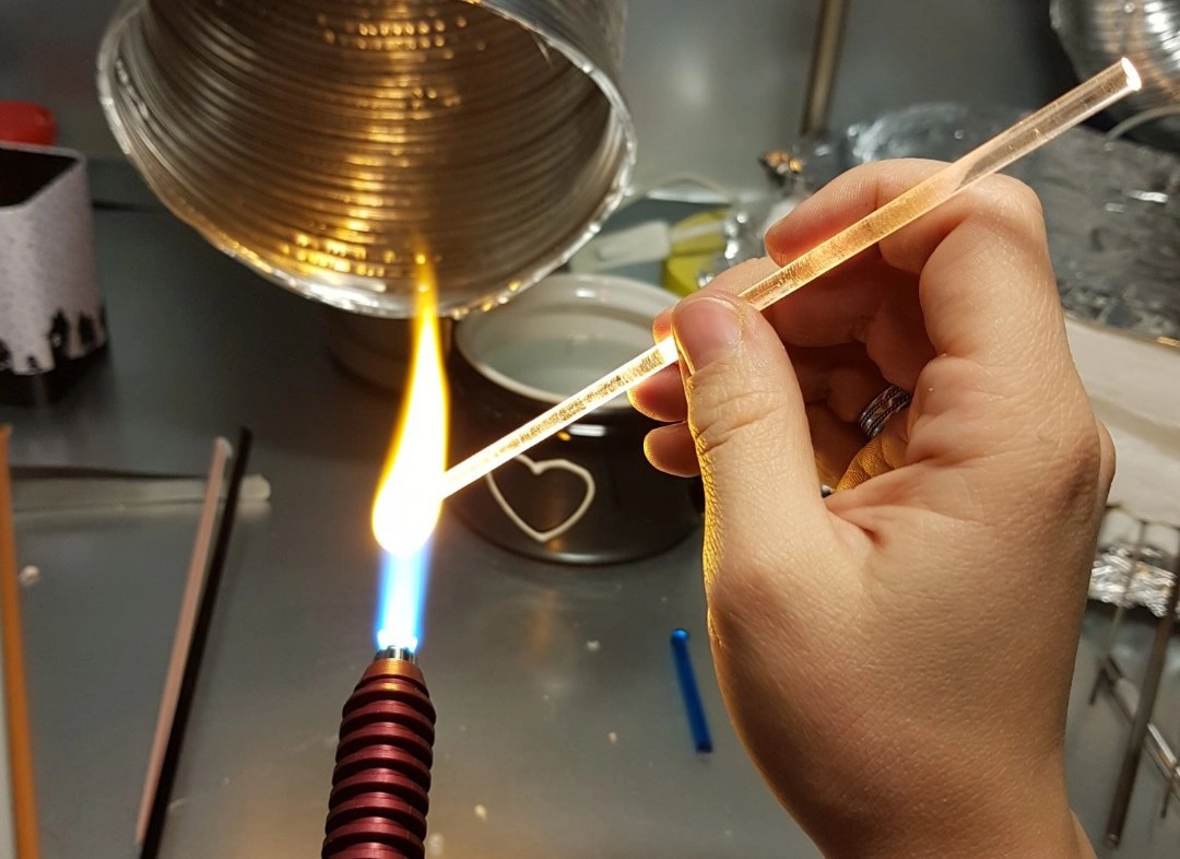 «Температура пламени горелки может достигать 1200 °C, стеклянные палочки плавятся и становятся мягкими, как карамель. И вот эту карамель можно наматывать на спицы — так получаются бусины. После того, как работа над бусиной закончена, я кладу ее в керамическое одеяло. Это нужно для того, чтобы стекло остывало постепенно, так как иначе оно треснет. После остывания, что обычно занимает часа два, я снимаю бусину со спицы и откладываю. Накопив некоторое количество стекляшек, отправляю их в муфельную печь на отжиг, чтобы выровнять внутреннее напряжение».