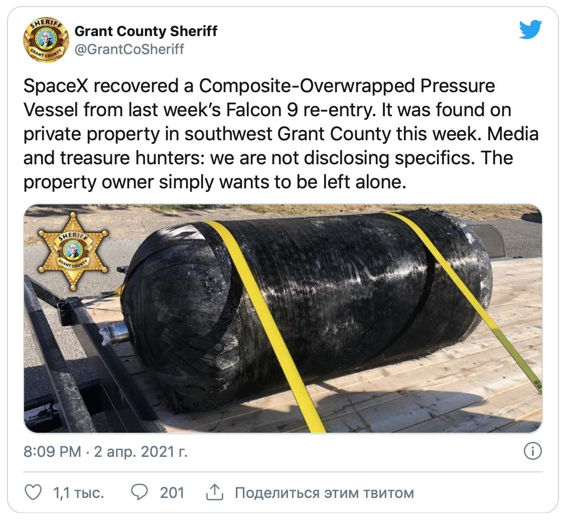 SpaceX забрала композитный бак высокого давления, упавший после повторного входа в атмосферу на прошлой неделе, — написал шериф в Twitter, призвав не беспокоить собственника территории, где упал бак.