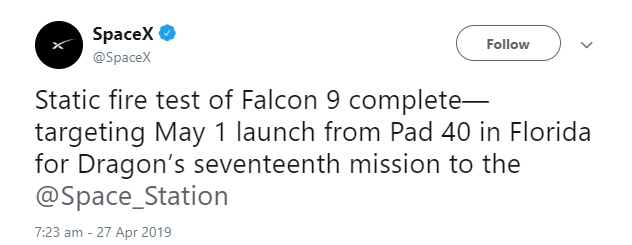 Статическое огневое испытание Falcon 9 завершено. Запуск 17-й миссии корабля Dragon к МКС назначен на 1 мая с площадки 40 во Флориде, — говорится в сообщении.