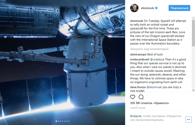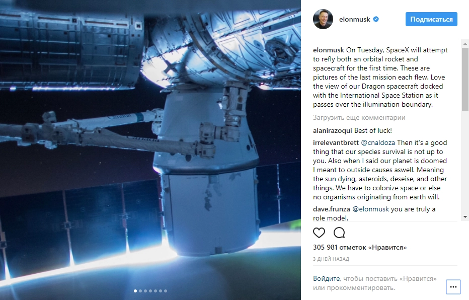 «Во вторник SpaceX впервые попытается запустить как орбитальную ракету, так и космический корабль. Люблю смотреть, как Dragon состыковывается с Международной космической станцией и проходит сквозь границу света»