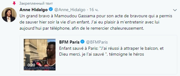 В своем Twitter благодарность Мамуду выразила мэр Парижа Анн Идальго.
