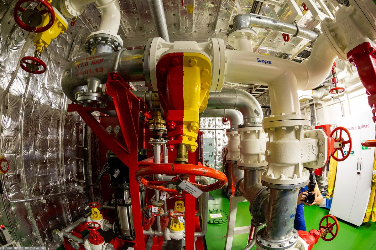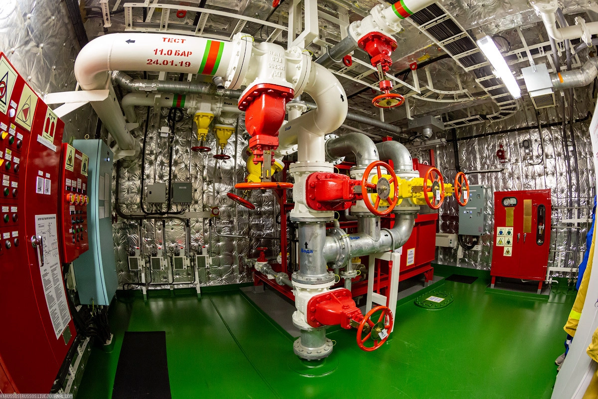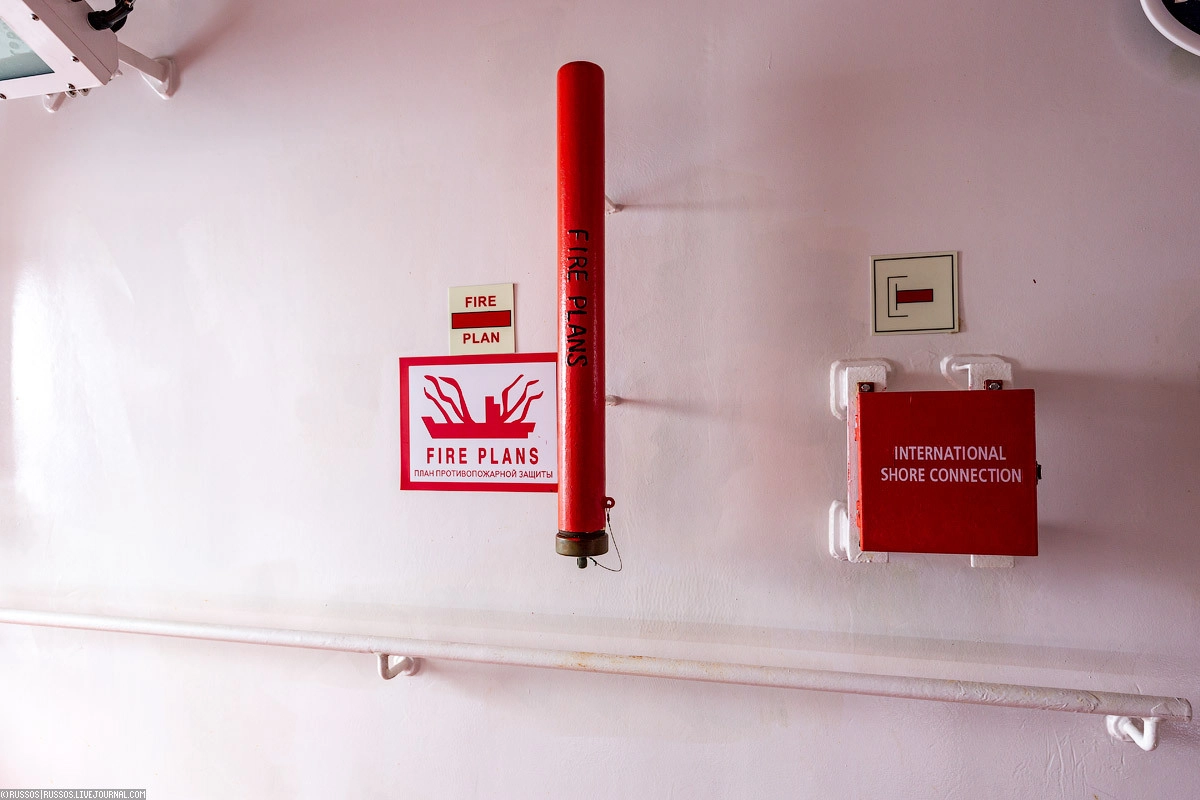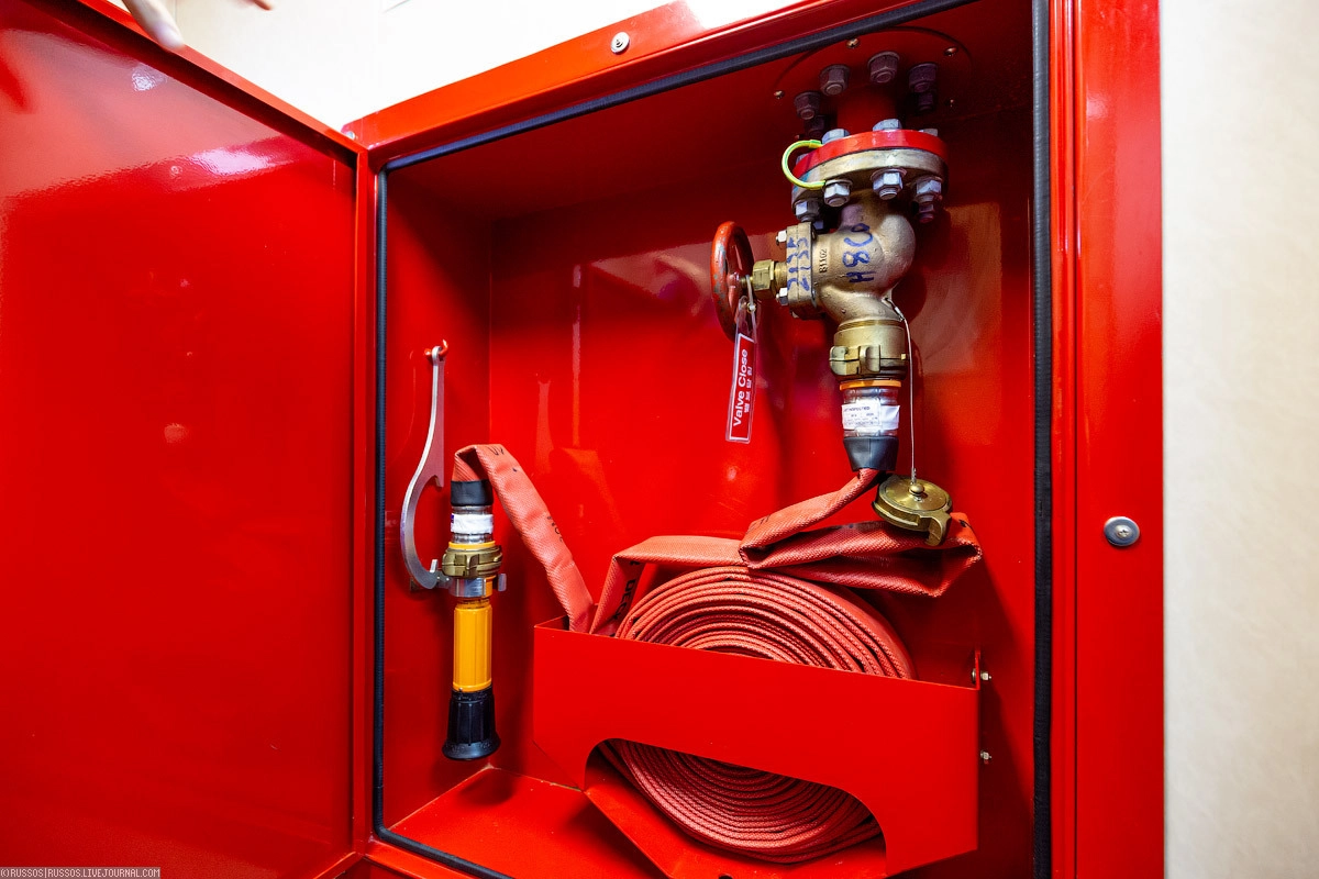 Во всех помещениях проложена система пожарного трубопровода. По всему судну установлены пожарные ящики с рукавами и брандспойтами. Это помимо огнетушителей, которые расположены также по всему судну.