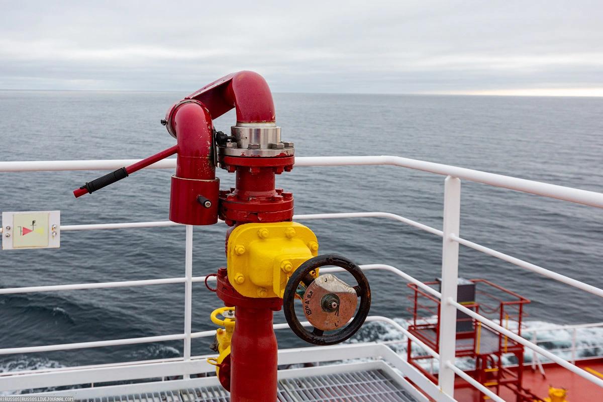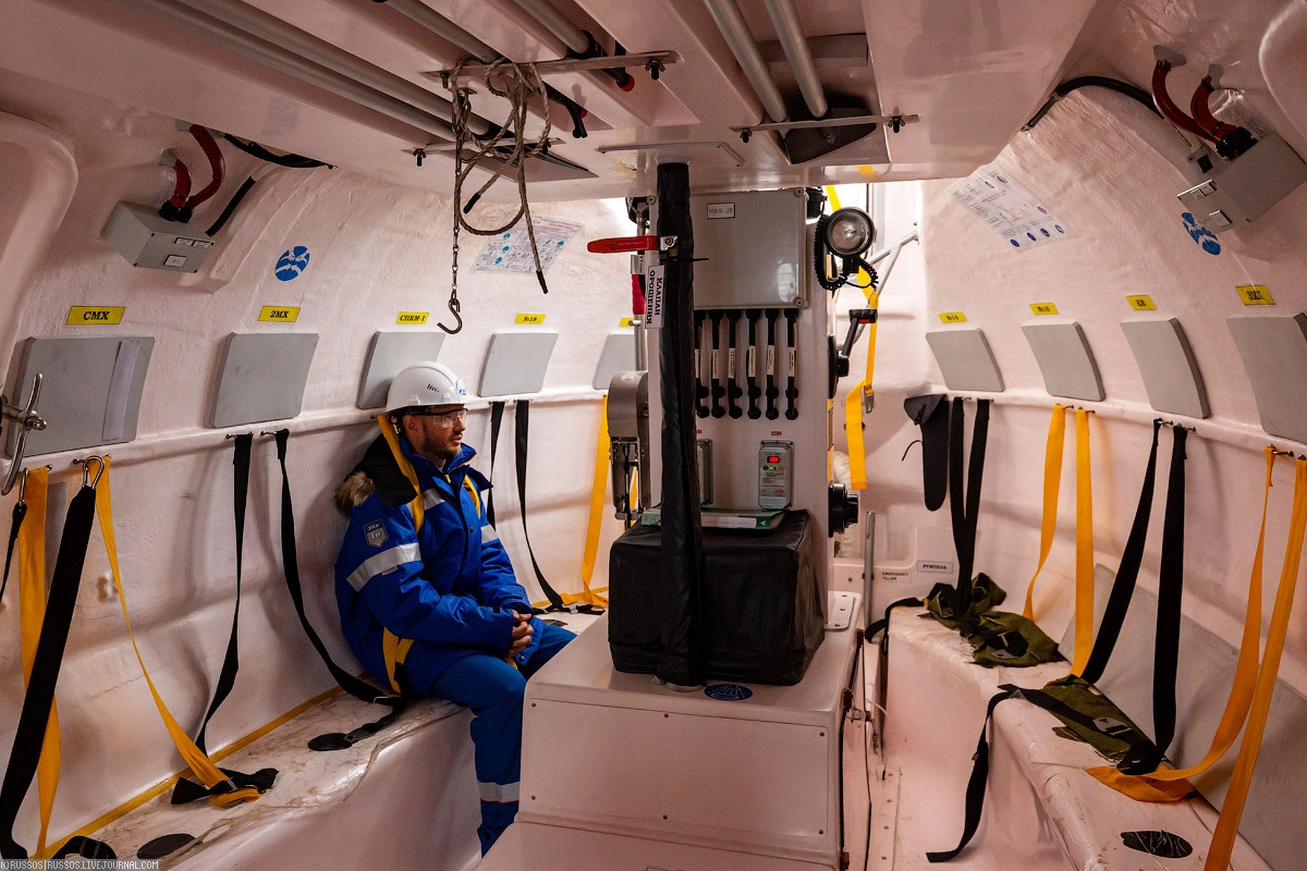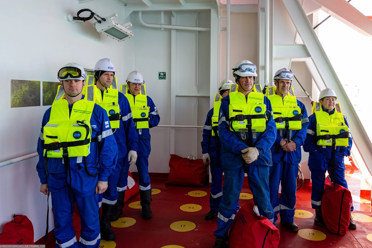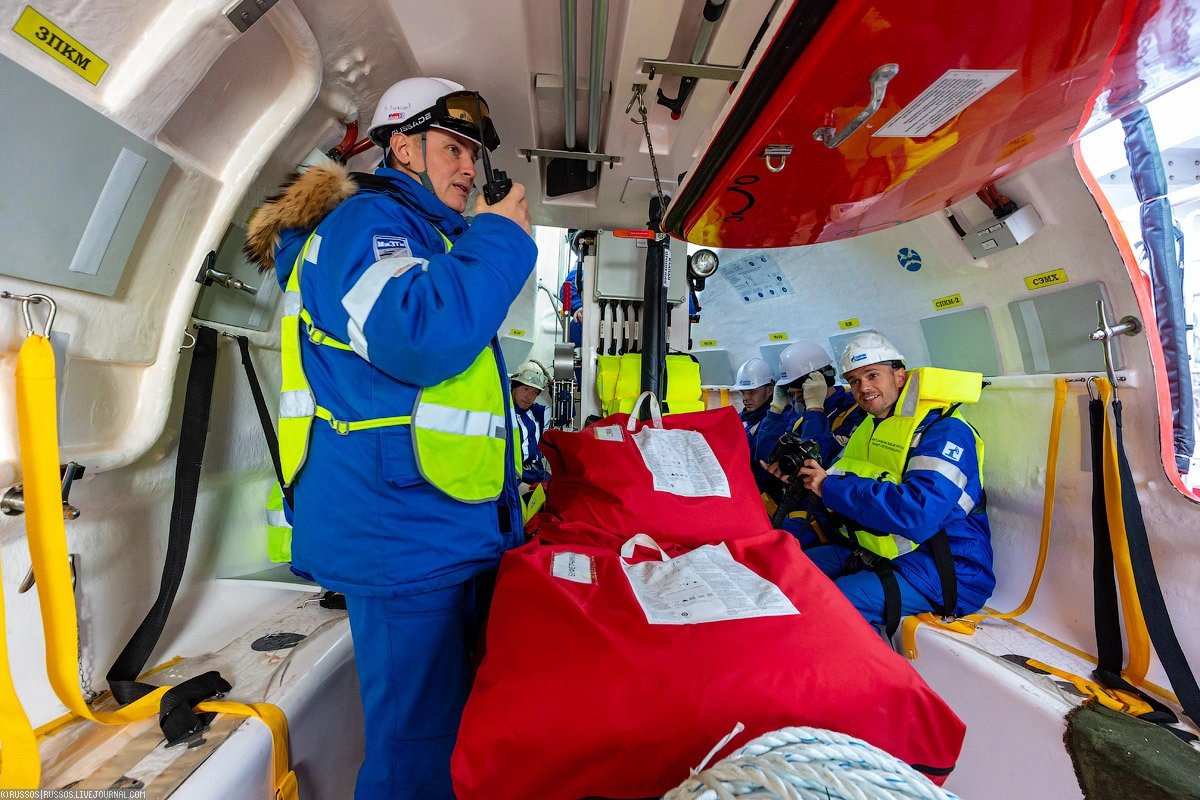 На арктическом танкере «Штурман Скуратов» «Газпром нефти» мы прошли инструктаж по правилам поведения на борту, использованию спасательных средств. Отдельно нам показали, как устроена противопожарная система и современная шлюпка. Самое главное правило для пассажиров очень простое — в случае объявления шлюпочной тревоги тепло одеться, взять сумку с гидрокостюмом и спасательный жилет. С этим комплектом прибыть на мостик и ждать указаний.
