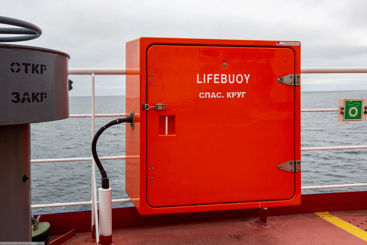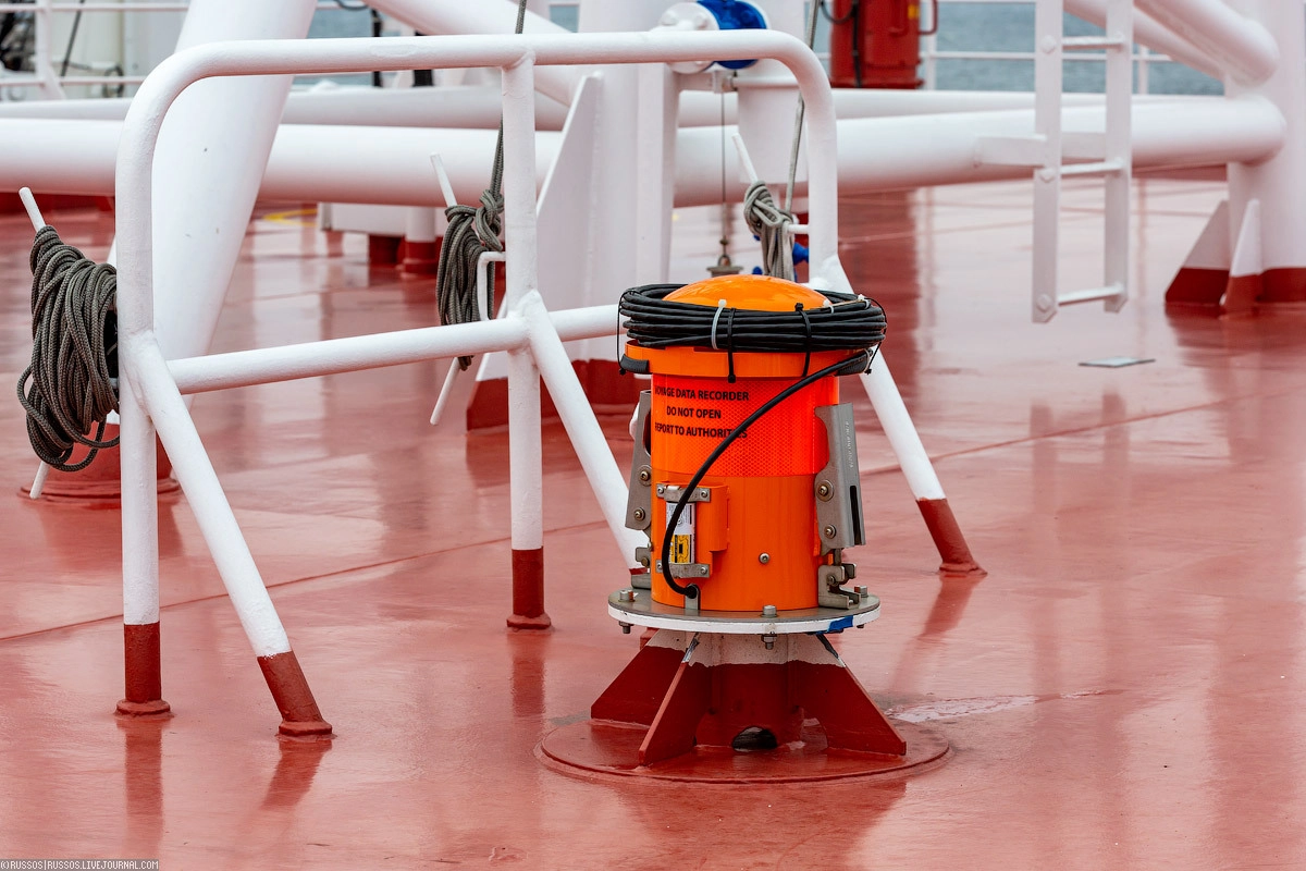 Авариный буй и «черный» ящик. Он пишет все параметры рейса и необходимые данные. Полный аналог такого же устройства на самолете. В случае затопления судна на определенной глубине он автоматически отстреливается и всплывает.