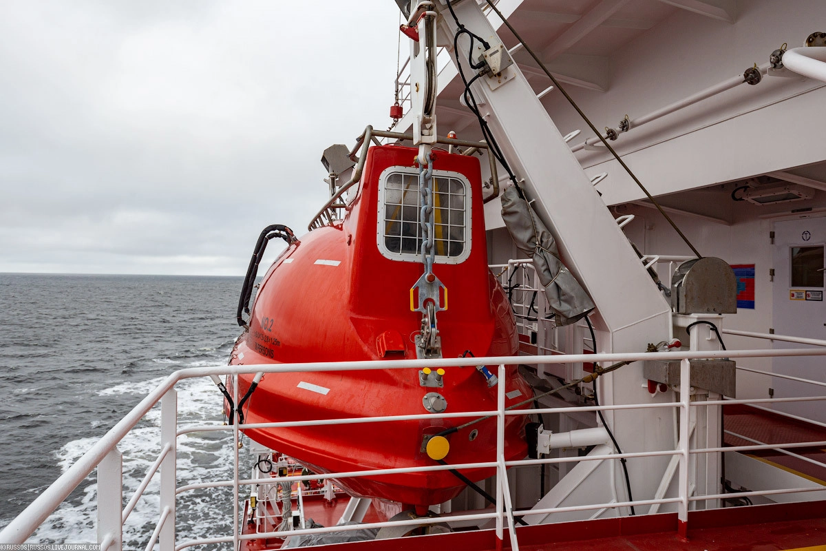 Это закрытая шлюпка в так называемом танкерном исполнении — она оснащена дополнительными средствами спасения, которые могут понадобиться при разливе и горении нефтепродуктов.