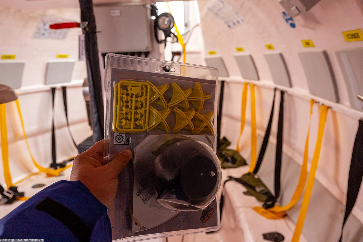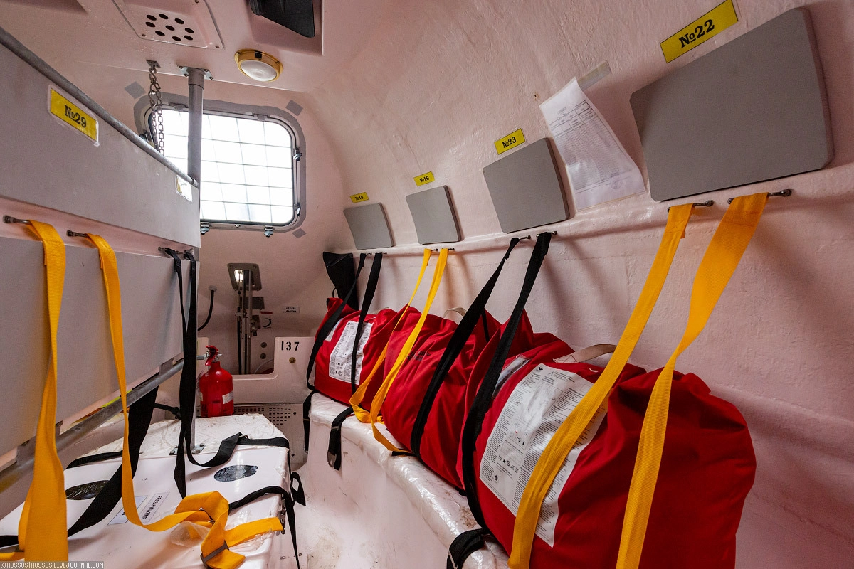 Шлюпка изнутри. Слева — корма, там же место командира. Справа — нос. По периметру — посадочные места для экипажа. По центру — провиант и оборудование. Металлическая полка по центру — обогреватель.