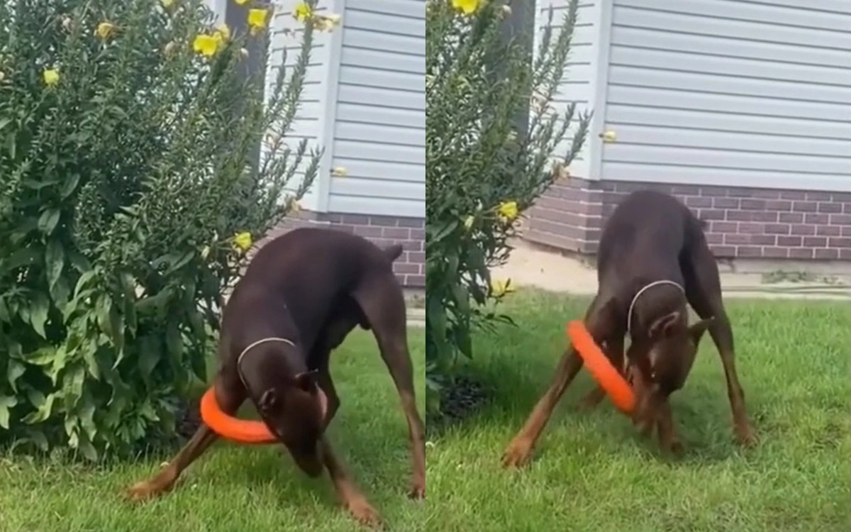 Пользовательница TikTok под ником gabriella_vincent902, поделилась роликом со своим семилетним доберманом, который умудрился попасть в «плен» к собственной игрушке. Собакен случайно надел тренировочное кольцо Puller (пуллер) на передние лапы и долго не мог понять, как его снять, чтобы снова нормально ходить и бегать. К счастью, пёсилю все-таки удалось освободиться, после чего он снова побежал играть с кольцом как ни в чем не бывало.