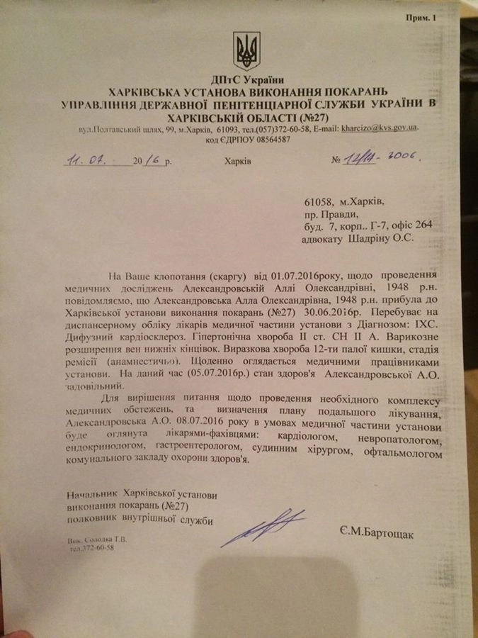 Врачи медсанчасти Харьковского СИЗО отказывают ей в надлежащей медицинской помощи. Накануне во время прогулки в СИЗО Алле Александровне стало плохо, она вынуждена была прервать прогулку, и в 11.00 обратилась за медицинской помощью...