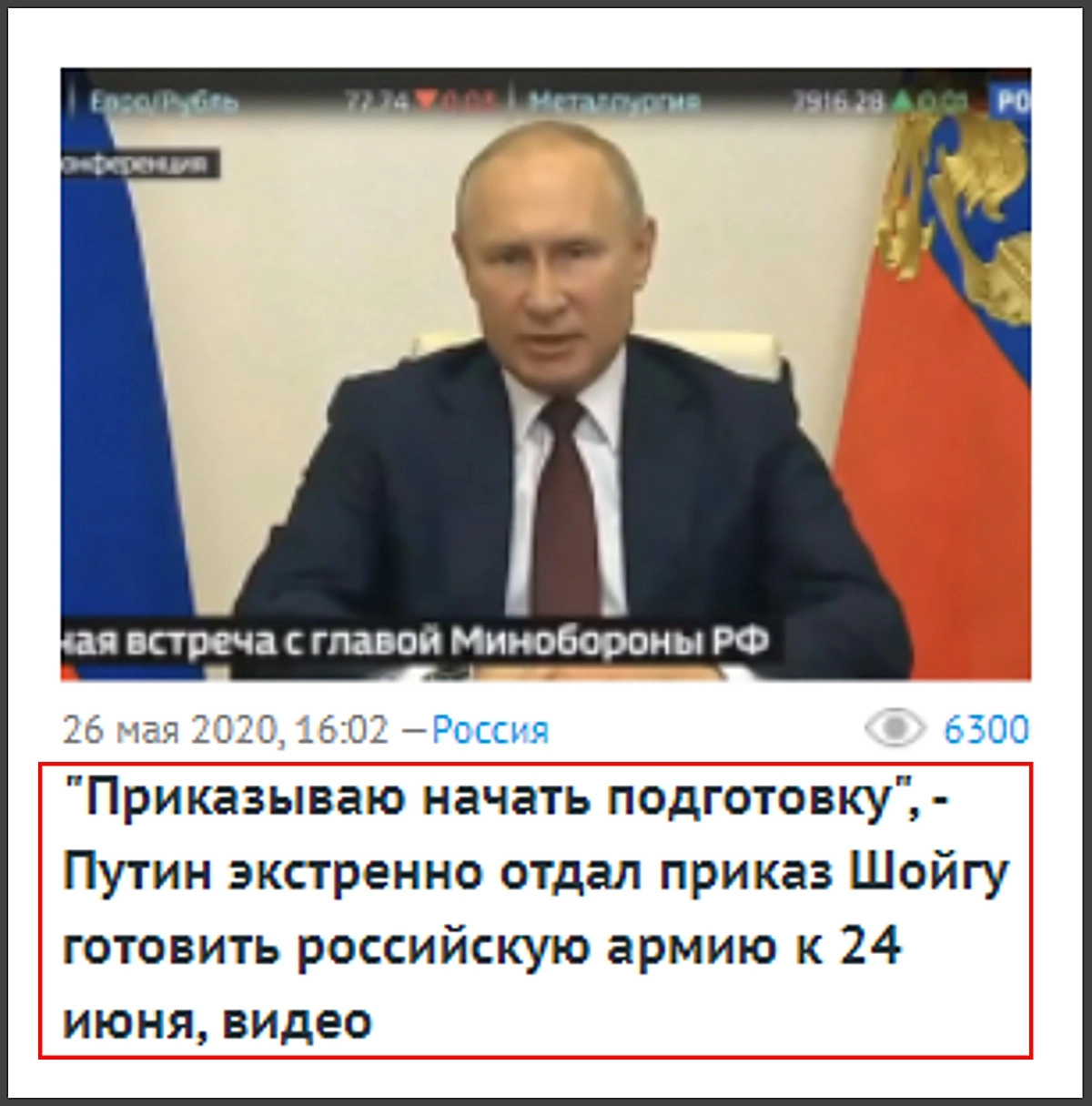 Зато «сенсации» о России публикуются там на регулярной основе, рассмотрим три наиболее очевидных фейка за последнюю неделю, которые прочитало больше всего посетителей. Так, накануне, 26 мая, президент России Владимир Путин распорядился начать подготовку к параду Победы, который в этом году пройдет 24 июня из-за пандемии коронавируса. А вот с каким заголовком подал новость Dialog.ua.