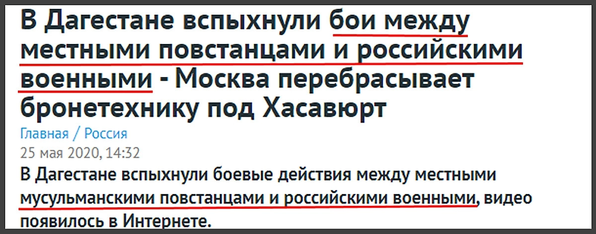 Название явно рассчитано на читателей, которых украинские СМИ уже шесть лет пугают рассказами о «русской агрессии». Вот другая статья с сайта, в которой рассказывается о недавней ликвидации в Дагестане шести боевиков Эндирейской группировки. В материале террористов называют повстанцами и героизируют их в глазах читателей.
