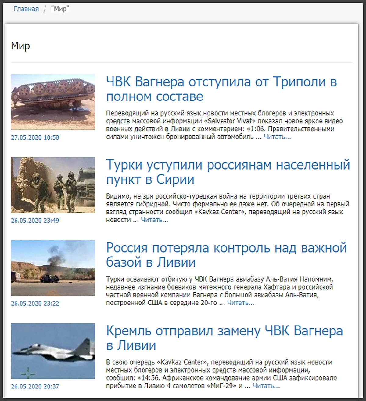 Винницкое издание хоть и является региональным, но освещает и мировые события. Вот только делает это очень избирательно. Раздел «Мир» на сайте практически полностью посвящен действиям российских военным в Сирии и войне в Ливии. Причем неизменно в связке с «ЧВК Вагнера».