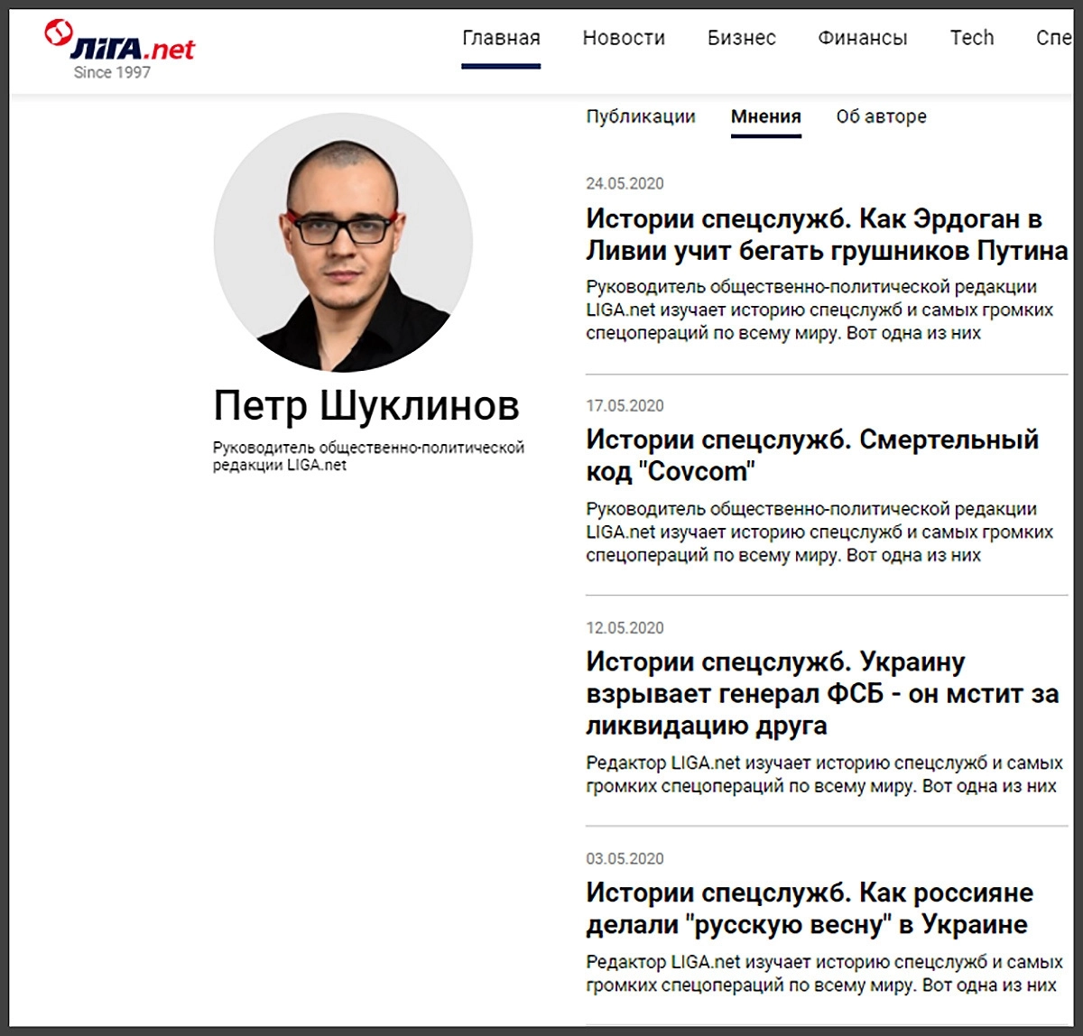 Как бы то ни было, в редакции «Лига.net» особо примечателен один из сотрудников — глава общественно-политического отдела издания Петр Шуклинов, по сути он отвечает за новостную повестку издания. Еженедельно он публикует статьи из собственной серии «Истории спецслужб».