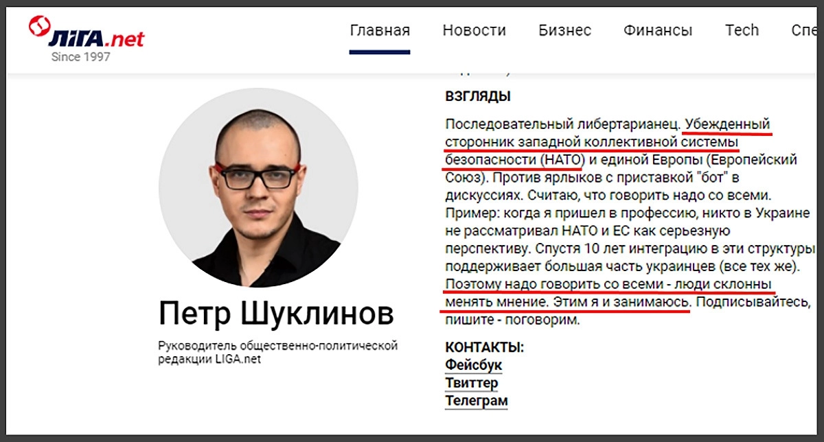Из его биографии следует, что весь его профессиональный путь связан исключительно с «Лигой». То есть выходит, вся эта серия «истории спецслужб» преследует одну главную цель — заставить украинцев полюбить НАТО. Добивается этой цели Шуклинов через распространение антироссийских настроений на Украине. Маловероятно, что такое насаждение «любви» происходит без согласования с представителями НАТО, а ярко выраженная в статьях лояльность «Лиги» к экс-президенту страны тому доказательство.