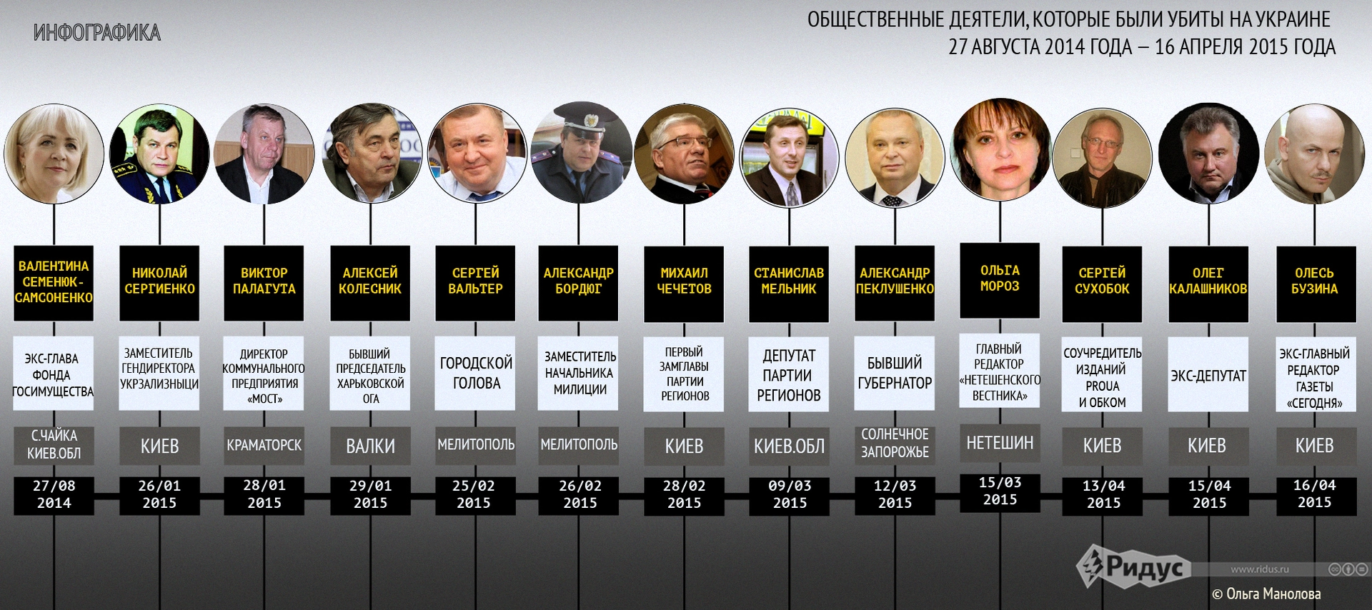 За последние три месяца по всей Украине — от запада до востока страны — погибли по самым разным причинам более десятка видных общественных деятелей из числа оппозиции, а также бывших чиновников.
