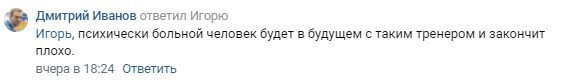 Разумеется, подобное поведение является абсолютно неподобающим. Тут не может быть никаких оправданий: вести себя подобным образом нельзя ни в коем случае. Надеюсь, данный горе-специалист будет немедленно уволен из спортивной школы без права работать с детьми в дальнейшем, — рассказала ФАН детский тренер Алина Фетисова.