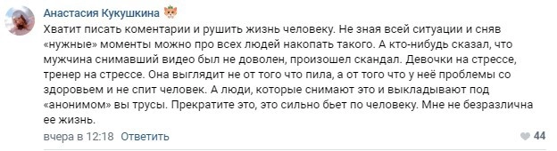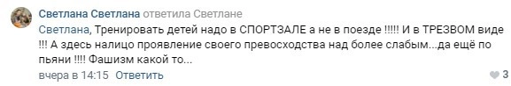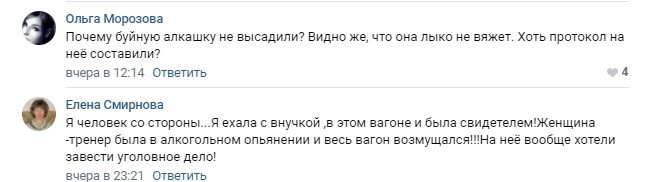 К сообщению прилагалась видеозапись, на которой начальник поезда и соседи по плацкартному вагону пытались урезонить подвыпившую тренершу: «Здесь что, вагон-спортзал?» По словам анонимного автора публикации, дело кончилось вызовом полиции и инспектора по делам несовершеннолетних на ближайшей станции.
