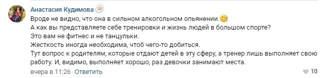 В то же время у руководительницы гимнасток нашлось неожиданно много заступников — в основном спортсмены, тренеры и их близкие. Они готовы были согласиться с претензиями к пьянству тренера, но не к методам ее работы. Да и то многие отмечали, что «надо же как-то снимать стресс».