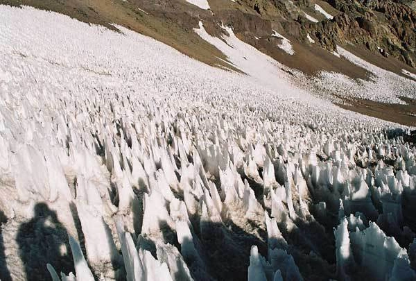 У ученых есть несколько предположений, как образуются такие шипы на Земле. По одной из версий, солнечные лучи, падающие под косым углом, неравномерно нагревают снежный покров, из-за чего на его поверхности появляются впадины и углубления, в которых таяние происходит намного быстрее. Такие проталины увеличиваются, оставляя на поверхности острые шипы.