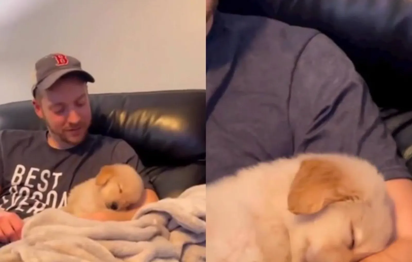 Спящий на ручках хозяина щенок умилит любого