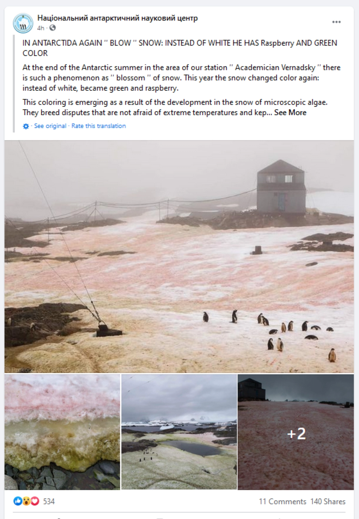 «Вместо белого стал зеленым и малиновым. Такая окраска появляется в результате развития в снегу микроскопических водорослей», — сообщила на своей странице в Facebook пресс-служба Национального антарктического научного центра.
