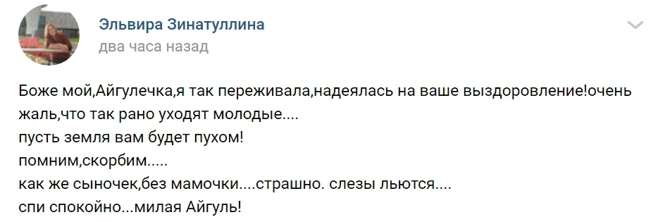 Очень печальная новость (о смерти). Ее (Айгуль) увезли в Алькеевский район, где похоронена ее мама. Двоюродный брат оформляет опекунство, — сообщила Наталья.