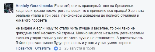 «На заметку СБУ! Стоит такая Анна с Первого канала, делает сюжет об армагеддоне в Киеве и Дне независимости, который является грустным праздником „для большинства“, напротив столичной мэрии. „В Киеве лихие девяностые. Стреляют и убивают. У „Южмаша“ проблемы без российского рынка сбыта. Кардиоцентр закрывают. Проблемы с вакцинами, альтернативу русским НЕ нашли“. Рассказ дополняют комментариями политэмигрантов Юрия Кота и Погребинского. Депортировать и запретить лазить по Киеву кругломордой с канала, который по решению СНБО