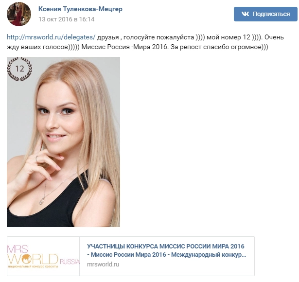 Ксения Туленкова в 2016 году принимала участие в отборе на конкурс красоты среди замужних девушек Missis Russia. На ее странице опубликованы фотографии с одного из этапов.