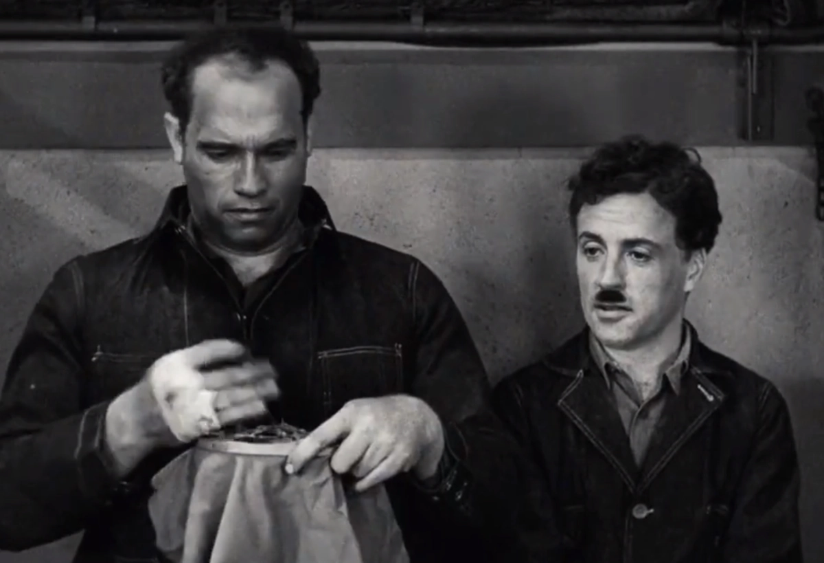 В своем ролике Монак решил показать, как бы Арни и Слай смотрелись в классических американских короткометражных комедиях образца 1920-х годов. Сталлоне заменил знаменитого актера Чарли Чаплина, а Шварцу досталась роль его сокамерника.