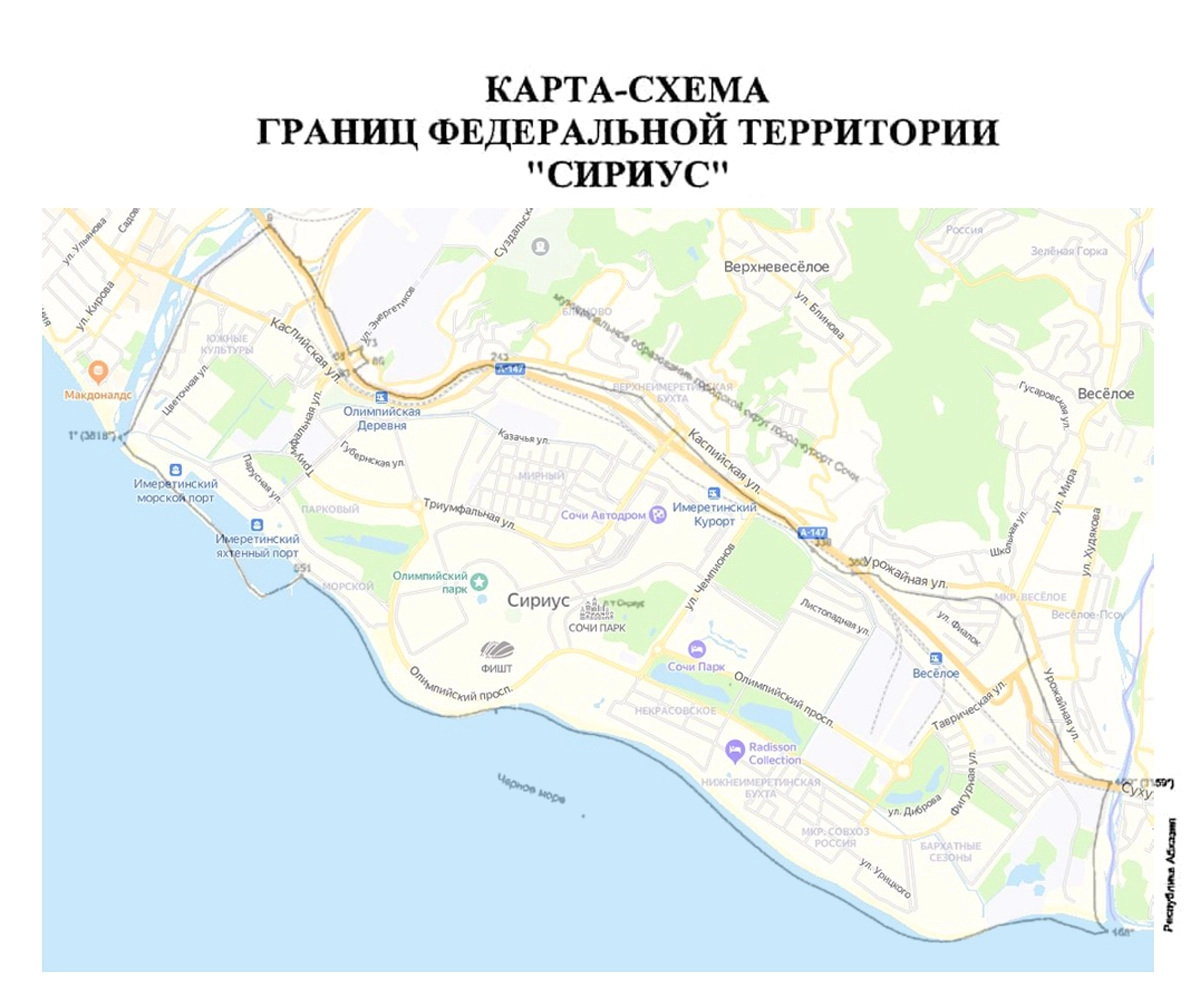 В Госдуму внесен законопроект о первой федеральной территории, которая получит название «Сириус» и будет располагаться в Краснодарском крае. Сириус протянется от Имеретинской бухты на черноморском побережье Сочи до абхазской границы.