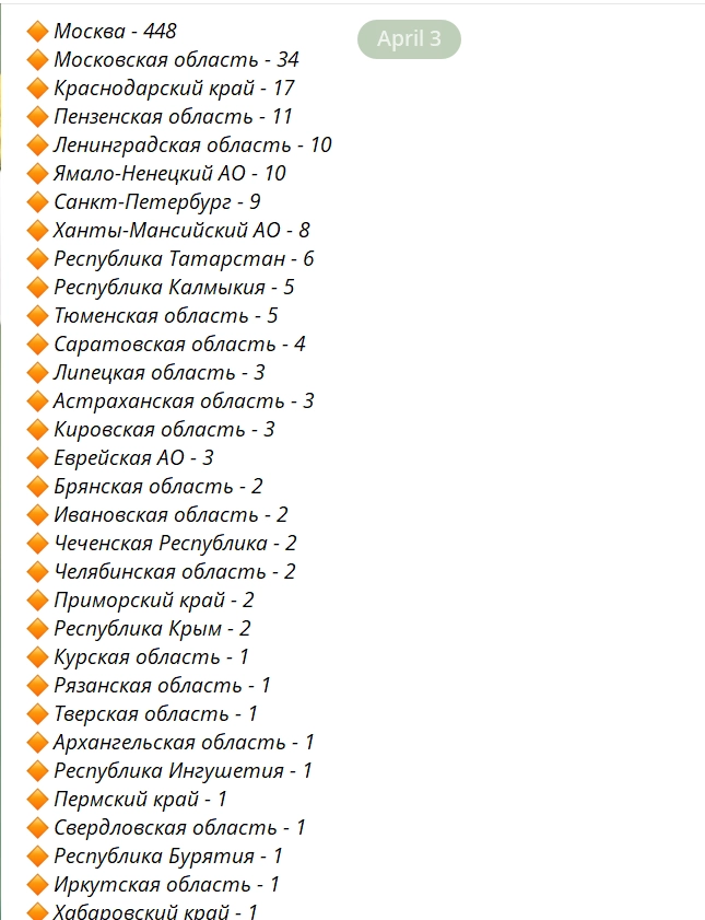 Оперштаб проинформировал о том, что в России за прошедшие сутки зафиксирован 601 новый случай заражения COVID-19 и четыре летальных исхода. Впервые диагнозы поставлены в Республике Ингушетия и Еврейской автономной области. Больше всего подтвержденных случаев — в Москве. При этом отмечается, что почти половина заболевших москвичей находится в возрасте младше 45 лет.