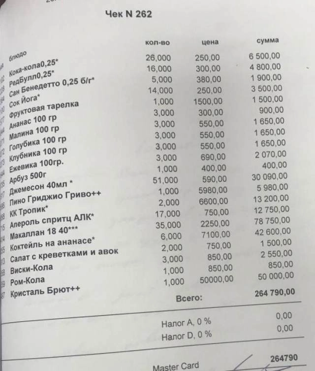 Сегодня же в сети появились фотографии чеков, по которым можно подробно ознакомиться с пристрастиями игроков и сопровождавшей их компании.