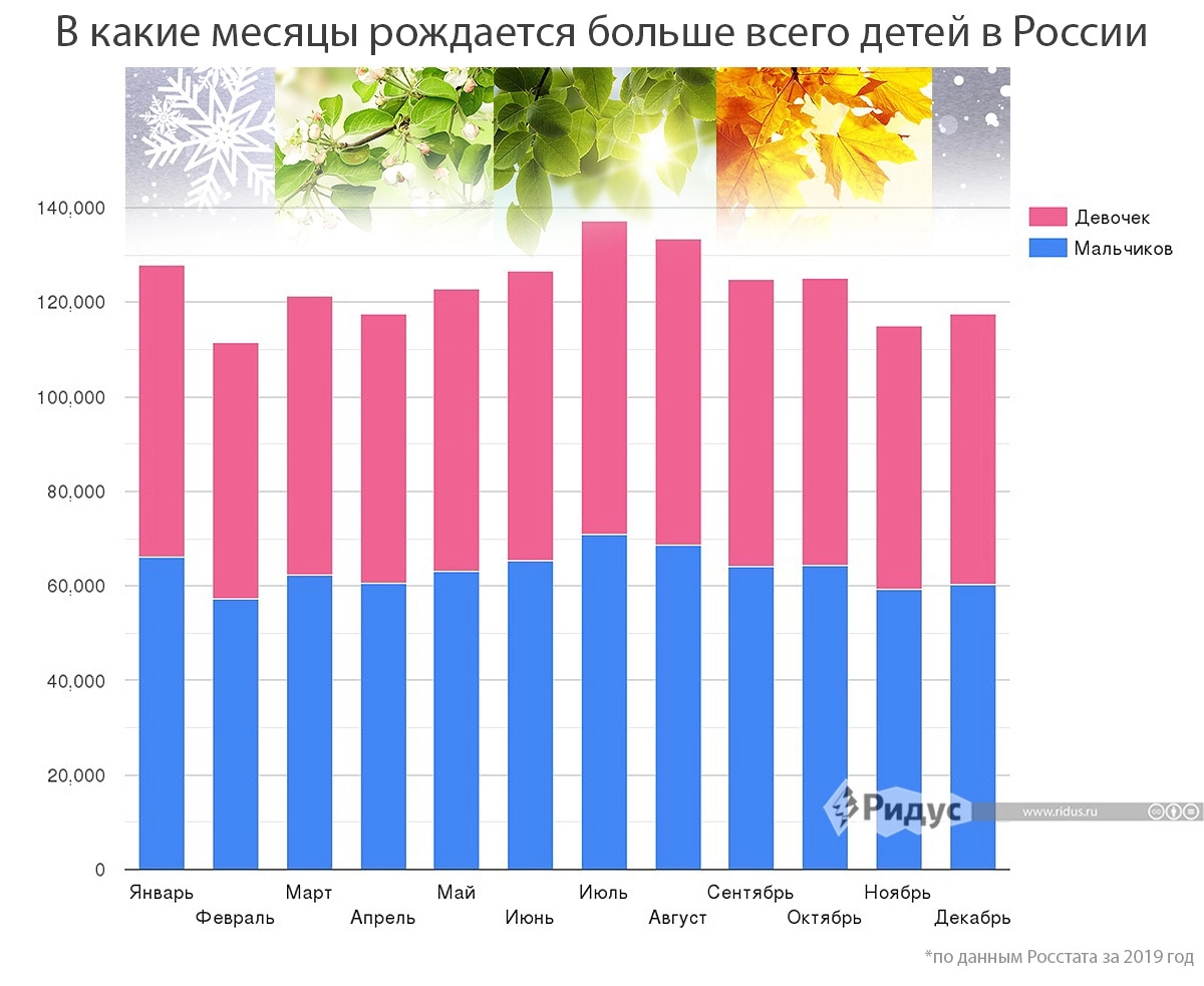 Больше всего детей в России в прошлом году родилось в июле, августе и январе, следует из данных Росстата, с которыми ознакомился «Ридус».