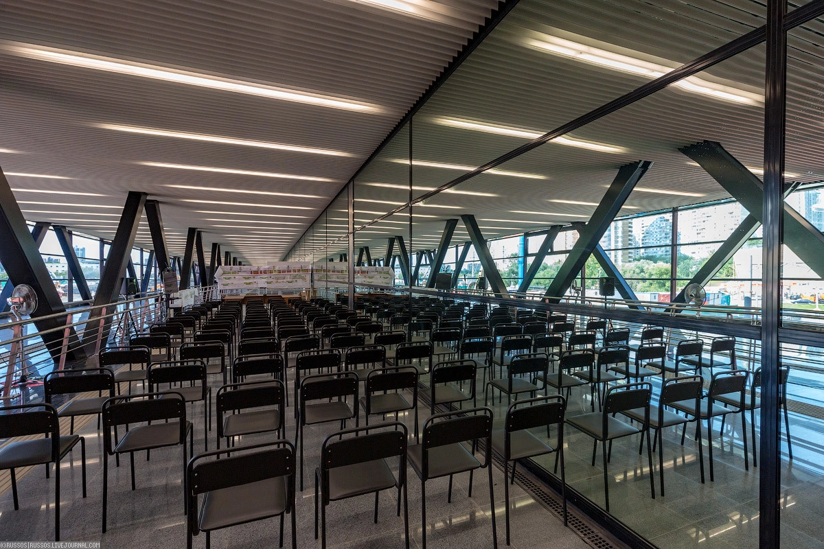14. Переход объединяет выход в город ко второму вестибюлю, переход на будущую станцию «Мичуринский проспект» Большой кольцевой линии и просто надземный переход.