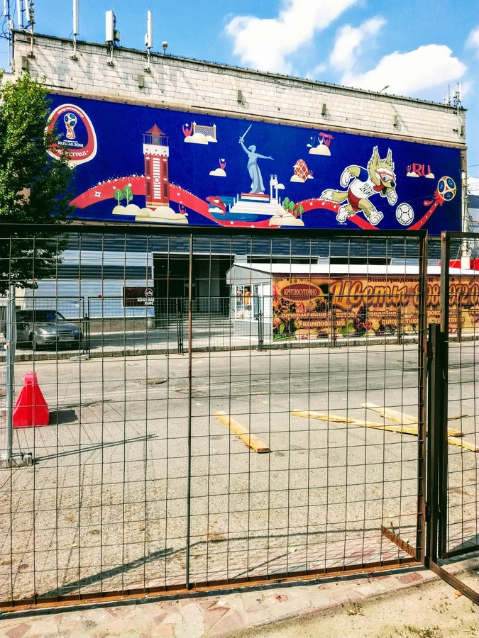 Еще в нескольких местах фасады или торцы зданий украшают тематические футбольные плакаты. Но они в основном стыдливо прикрывают фасады «заброшек», которых даже на центральных улицах миллионного города слишком много, чтобы успеть отреставрировать их за оставшиеся до начала ЧМ двести с небольшим дней.