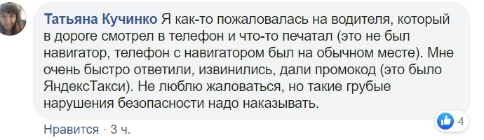 Попросила выключить телефон. Он сказал, что в телефоне у него навигатор, и переключился на навигатор. Но он его в руке держит и на дорогу почти не смотрит. А сейчас, увидев, что я фотографирую, он пытается высадить меня из машины, — сказано в посте Юлии.