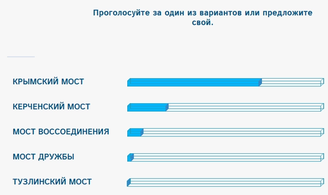 Всего предлагается пять вариантов названия: Крымский мост, Керченский мост, мост Воссоединения, мост Дружбы и Тузлинский мост. Пока лидером голосования является первый вариант.