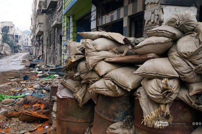 Лифты в примыкающих к Старому Хомсу высотных зданиях не работают. Поднимаемся наверх пешком по лестницам, усыпанным битым стеклом, гильзами, остатками того, что когда-то было частью чьего-то уюта. Все двери выломаны. Сквозь пространство пустых квартир видны пробитые обитавшими тут ранее бандитами ведущие на улицу дыры-бойницы. Сейчас здание занято сирийскими военными. Бойницы «работают» против тех, кто их когда-то прорубил.