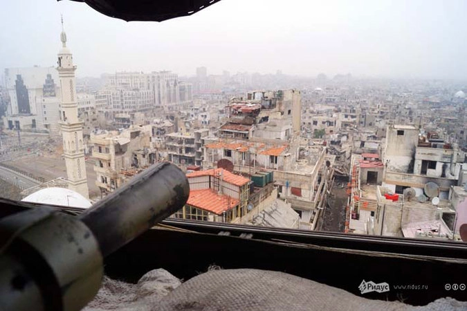 С одной стороны – великолепный вид на крепостной холм, на котором наблюдаются остатки арабской крепости. Крепость Усамы построена на месте массы более древних цитаделей. Сохранилась плохо и причиной тому никак не нынешняя война. Сама крепость занята армией. С запада от крепости – солдаты сирийской регулярной армии. К востоку – те, благодаря кому Старый Хомс и ряд других районов города сегодня нуждается если не в сносе, то в капитальном ремонте. Боев, как таковых, тут практически нет. Обмениваются «любезностями» на расстоянии. Вражеские снайперы применяют тактику, которая и ведет к значительным разрушениям: используя сквозные бойницы-отверстия снайпер контролирует улицу, сидя где-то в глубине здания. Достать его, сидящего за двумя или тремя стенами можно только с использованием танка. Результат попыток ликвидировать снайперов и отодвинуть их еще дальше от позиций армии у меня перед глазами.