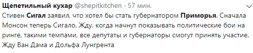 Голливудский актер Стивен Сигал, получивший осенью 2016 года российское гражданство, хочет стать губернатором Приморского края. Об этом он рассказал на встрече со зрителями международного кинофестиваля стран Азиатско-Тихоокеанского региона «Меридианы Тихого» во Владивостоке.
