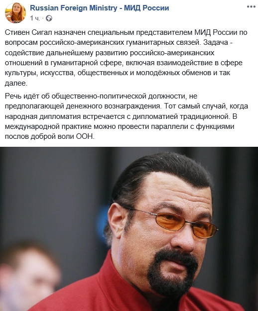 Популярный голливудский актер и мастер боевых искусств Стивен Сигал назначен специальным представителем МИД России по вопросам российско-американских гуманитарных отношений, сообщается на странице дипломатического ведомства в Facebook.