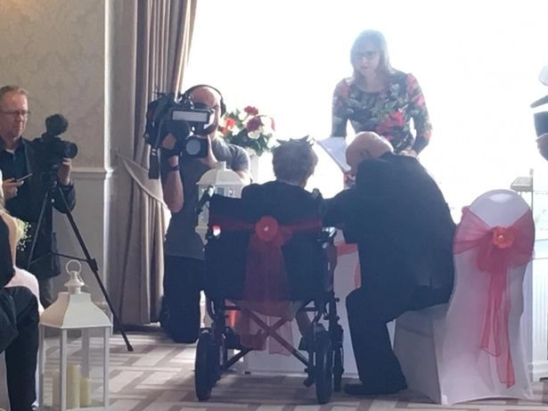 Свадьбу сыграли в отеле The Beaches Hotel города Престенин в уэльском графстве Денбишир, недалеко от дома пары. На получасовую церемонию пришли 30 гостей — родственники и друзья молодожёнов. Жених сам отвёз невесту в коляске к алтарю под песню «Dancing Queen» («Танцующая королева») группы ABBA.