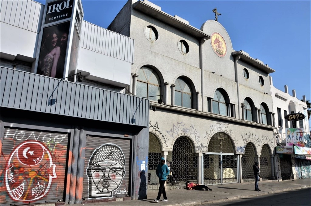 Церковь ливанских маронитов, уродливо разрисованная граффити и для пущего колорита со спящим бомжом при входе —