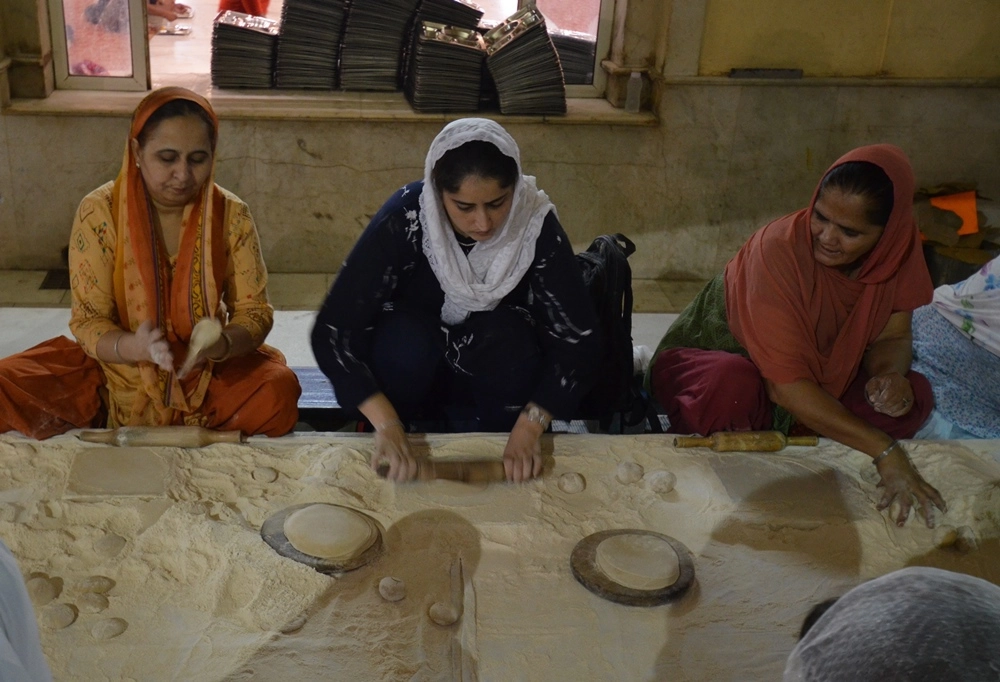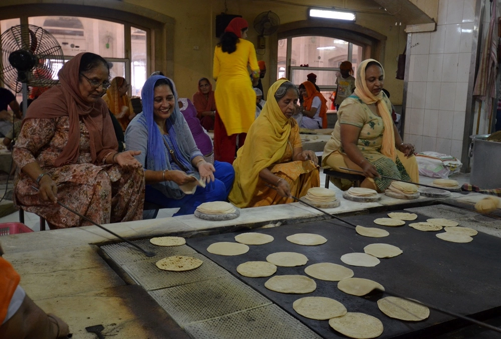 28. В храме есть огромная столовая, где бесплатно раздают специально освящённую еду. Мы посетили кухню этой столовой, где в огромных котлах томится какая-то жутко ароматная местная еда, а по соседству женщины делают лепёшки. Пробовать освящённую еду я не стал — а просто прогулялся по кухне. На этом фото — «окошко раздачи».