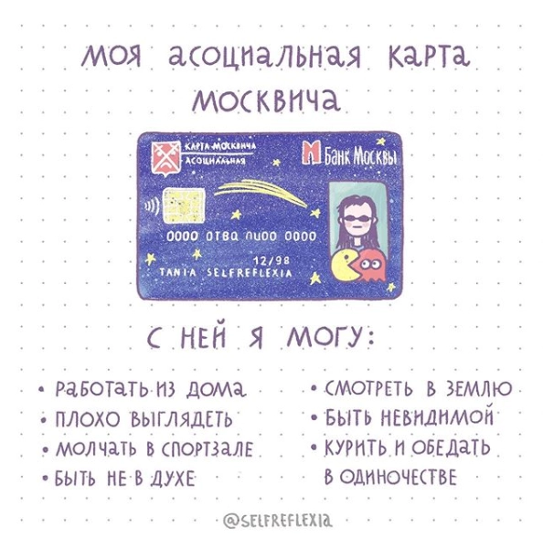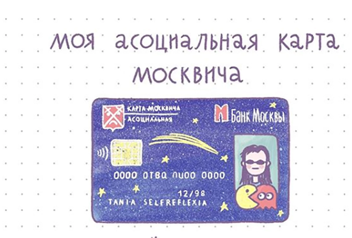 В Сети опубликован проект асоциальной карты москвича. Его предложила на своей странице в Instagram столичная художница по имени Татьяна, известная в Рунете под псевдонимом Tania Selfreflexia.
