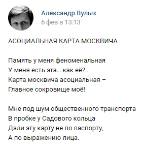 Идея асоциальной карты москвича на самом деле уже давно носилась в воздухе. В последние несколько лет о ней часто каламбурили в интернете, а самодеятельные поэты еще и слагали стихи.