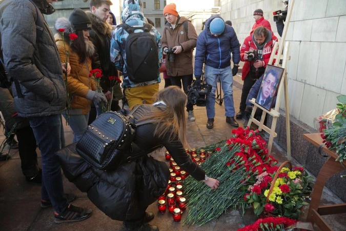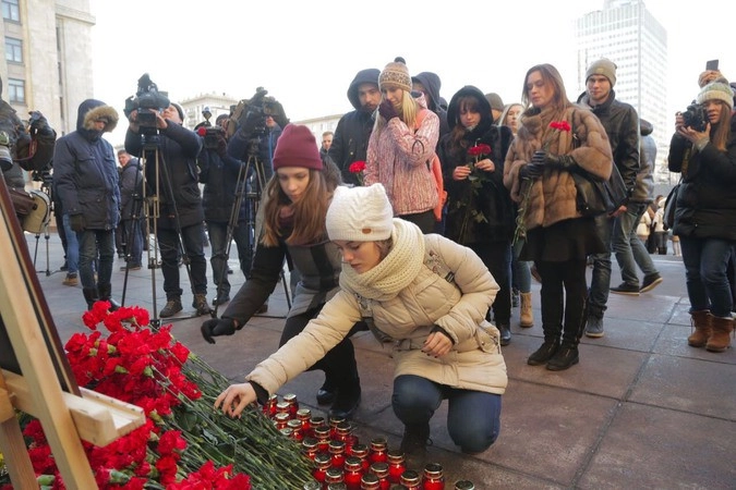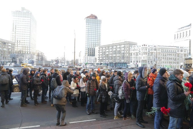 Студенты вузов Москвы собрались у здания МИД, чтобы почтить память убитого дипломата Андрея Карлова. В траурном возложении цветов приняли участие 350 человек.